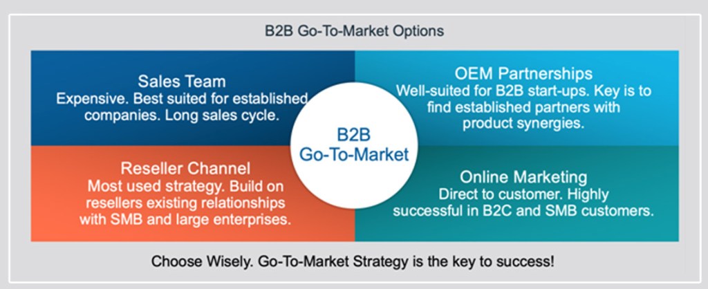 One of the key elements for a product to succeed in the marketplace is to choose the correct Go-To-Market strategy for the product. Even though it is true for all products, it is even more important to select the right go-to-market strategy for the enterprise products, as the business-to-business (B2B) product sales cycle is usually long. Additionally, since most B2B products are sold through a human connection, it is important to understand pros and cons of all available options before investing in the required resources. If the product is developed within a large organization with paying customers, it is logical to use the existing sales team to reach out to the existing customers to introduce the product to the marketplace. Even then it is important to look at other options such as OEM (Original Equipment Manufacturer) partnerships as well as reseller channels.